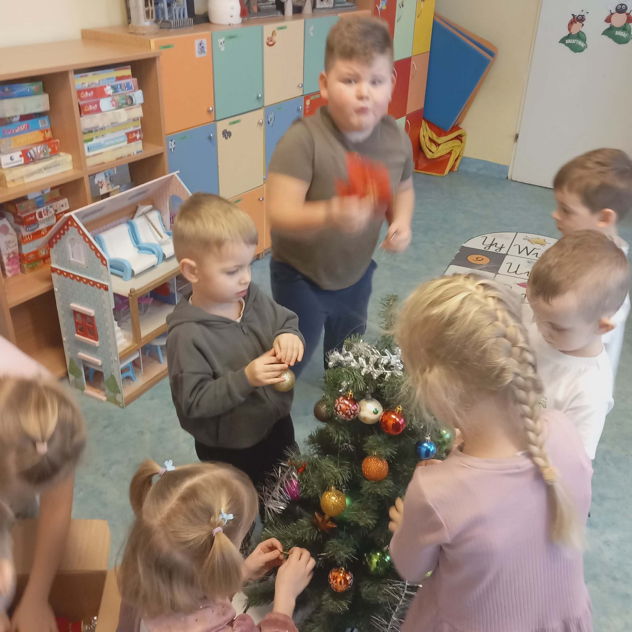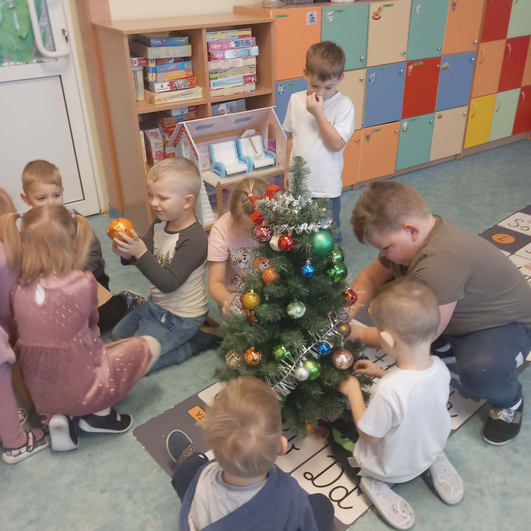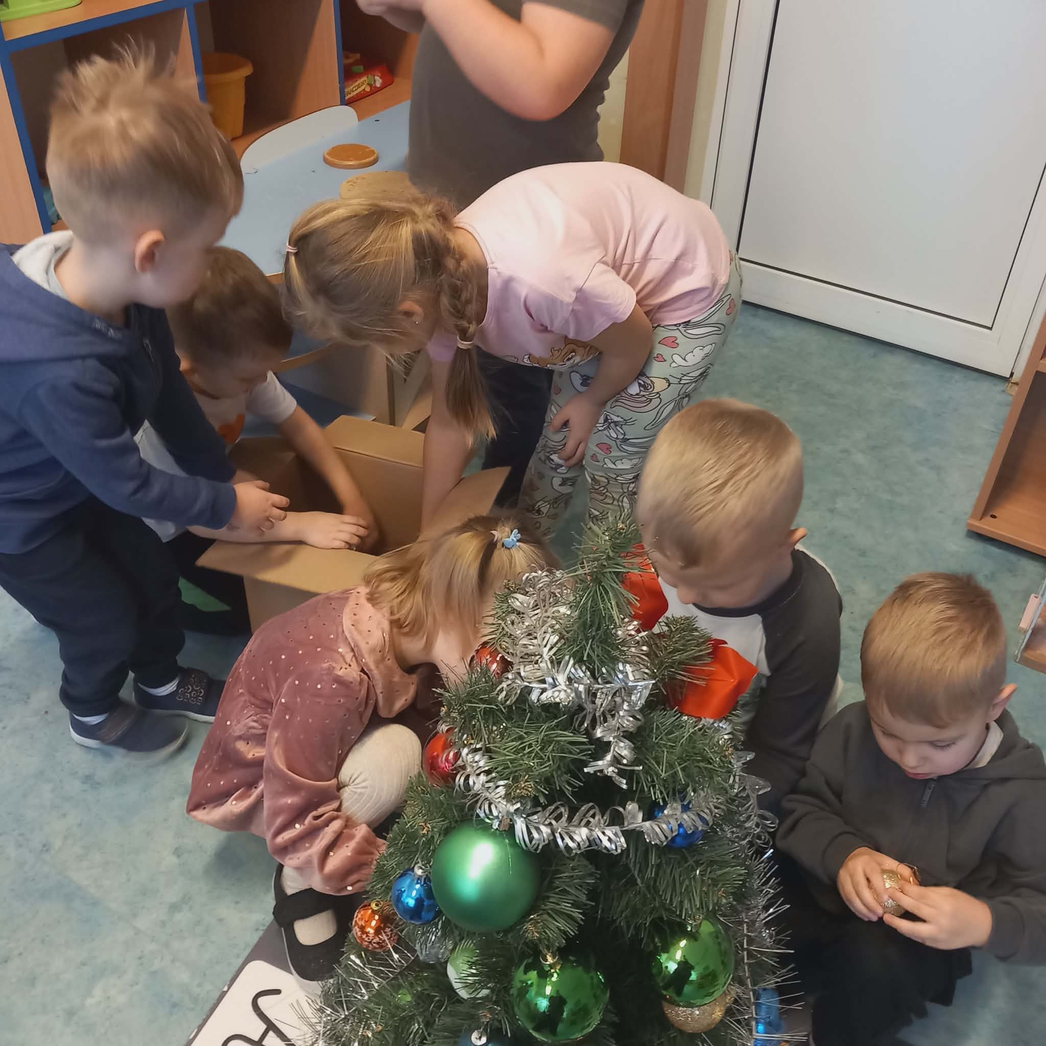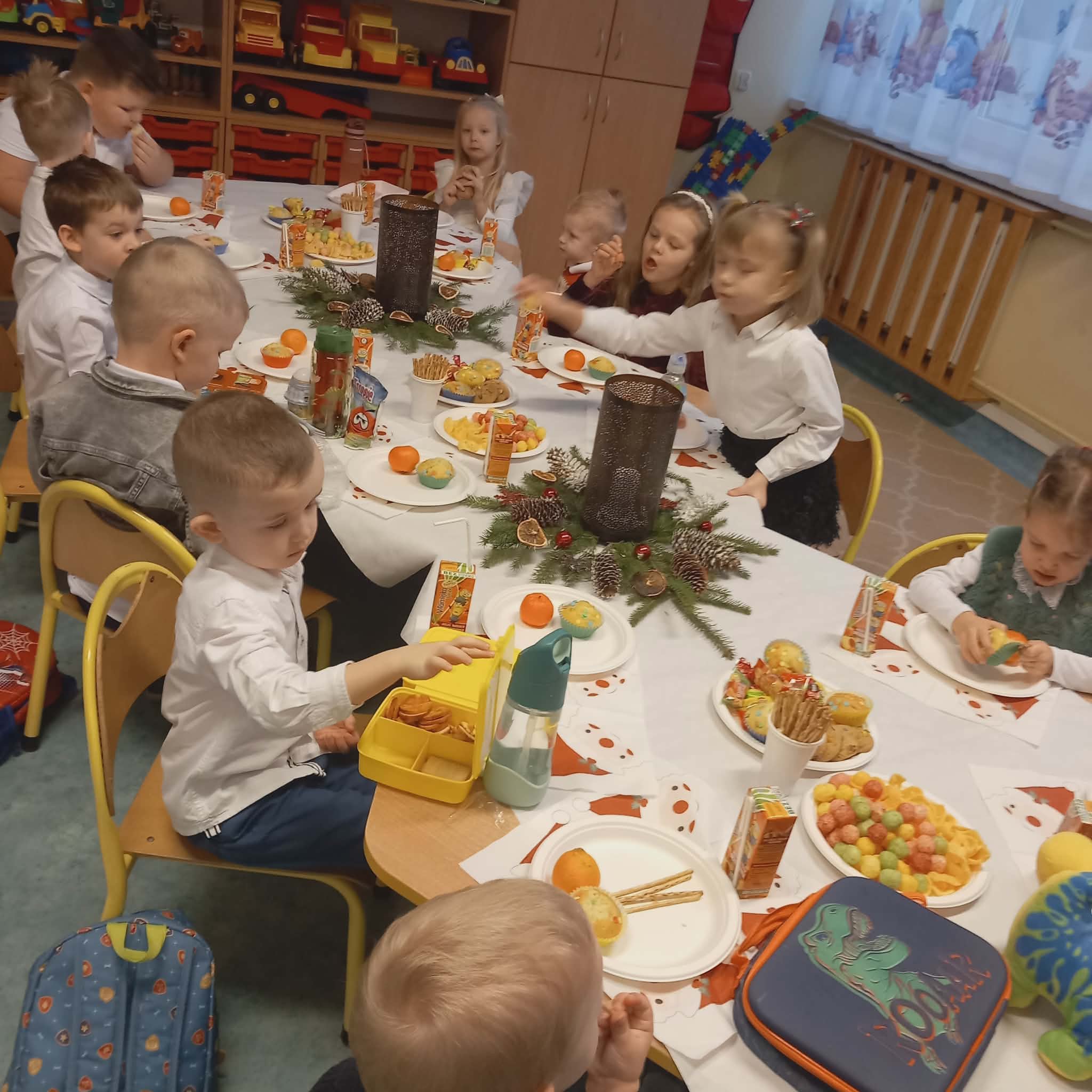 Okres przedświąteczny w naszym przedszkolu był pełen radości i przygotowań. Dziś odbyła się przedszkolna Wigilia, która była wyjątkowym wydarzeniem dla wszystkich dzieci. Przedszkolaki otrzymały miłe upominki, które Mikołaj zostawił niespodziewanie, sprawiając im wiele radości. Przed świętami wspólnie przygotowywaliśmy się do tego dnia, wykonując różne prace plastyczne i dekoracje, dzięki którym w przedszkolu zapanowała prawdziwie świąteczna atmosfera.