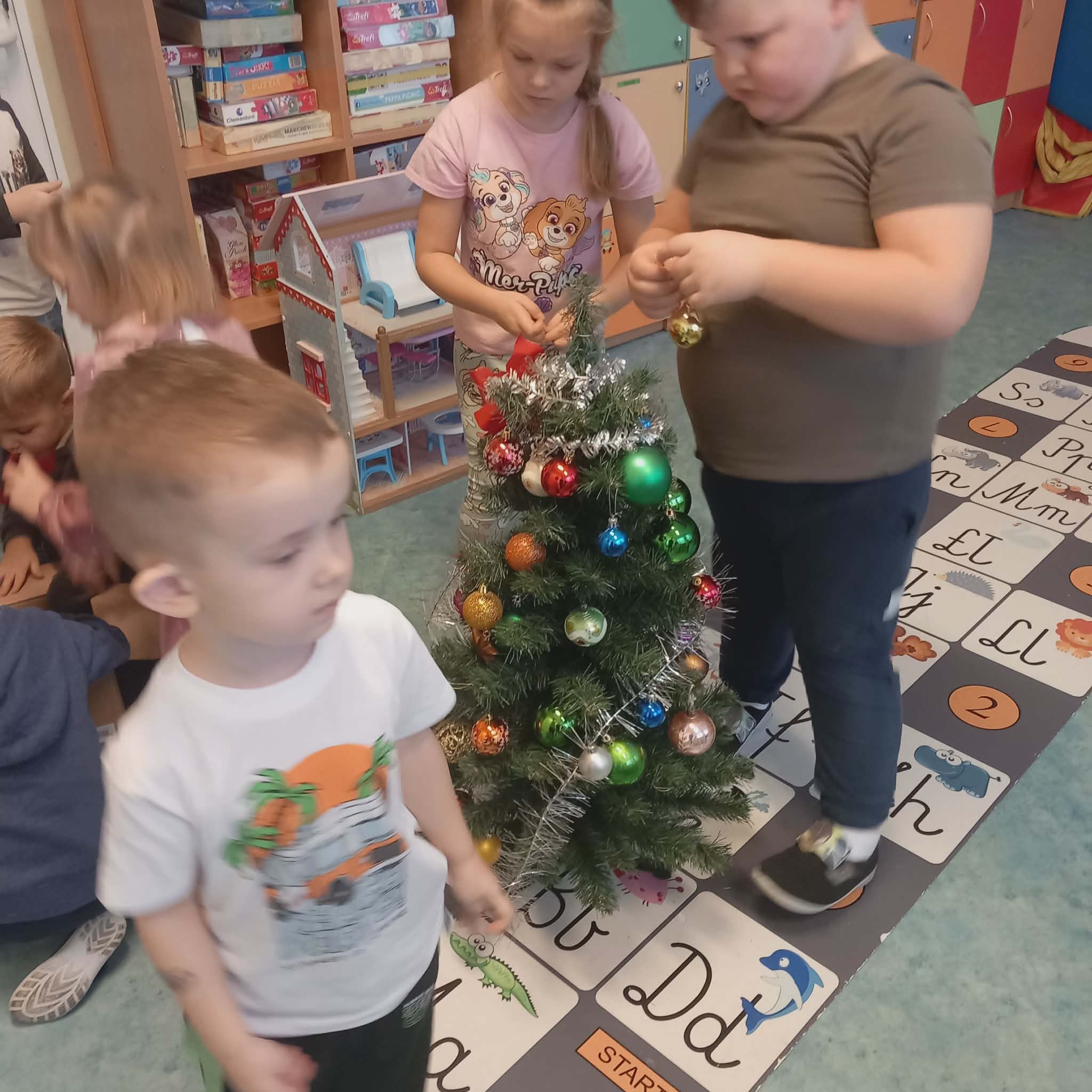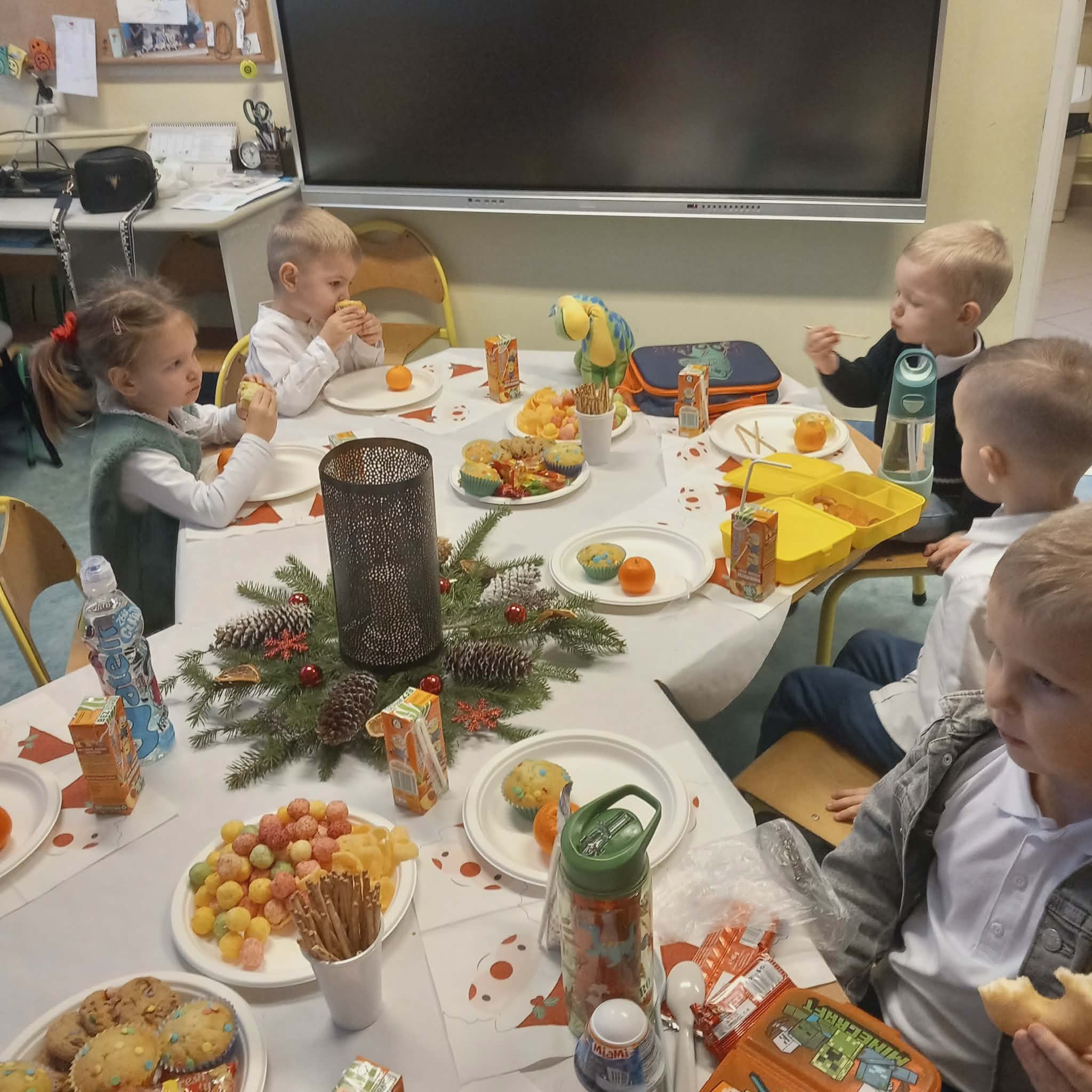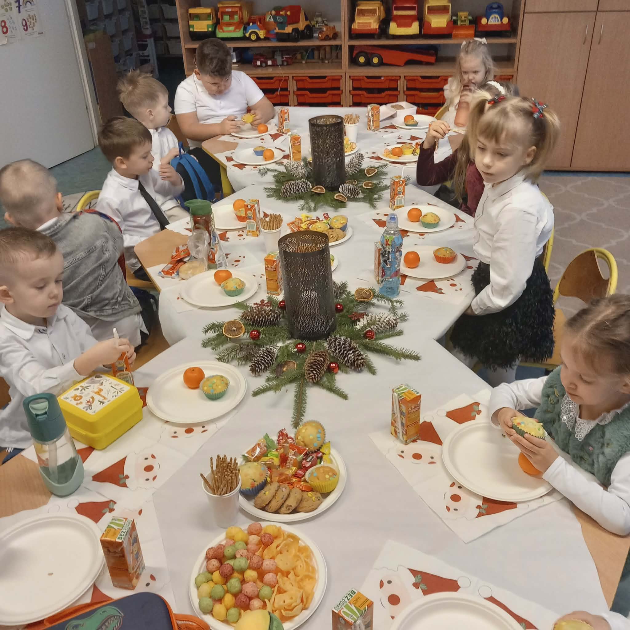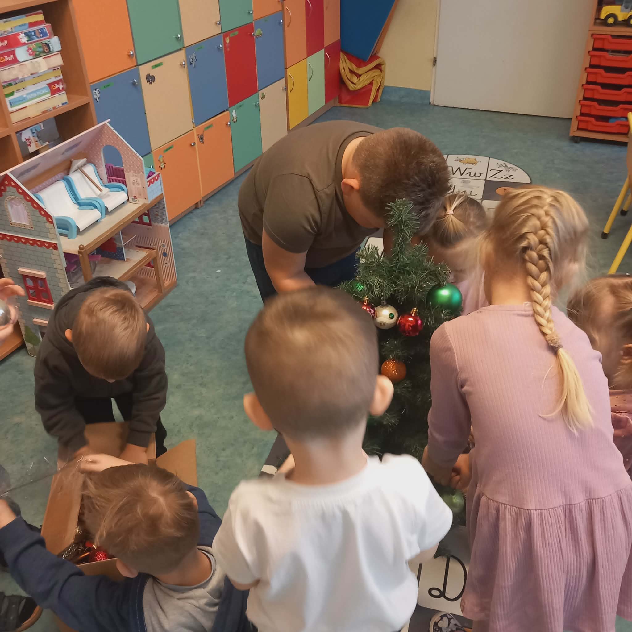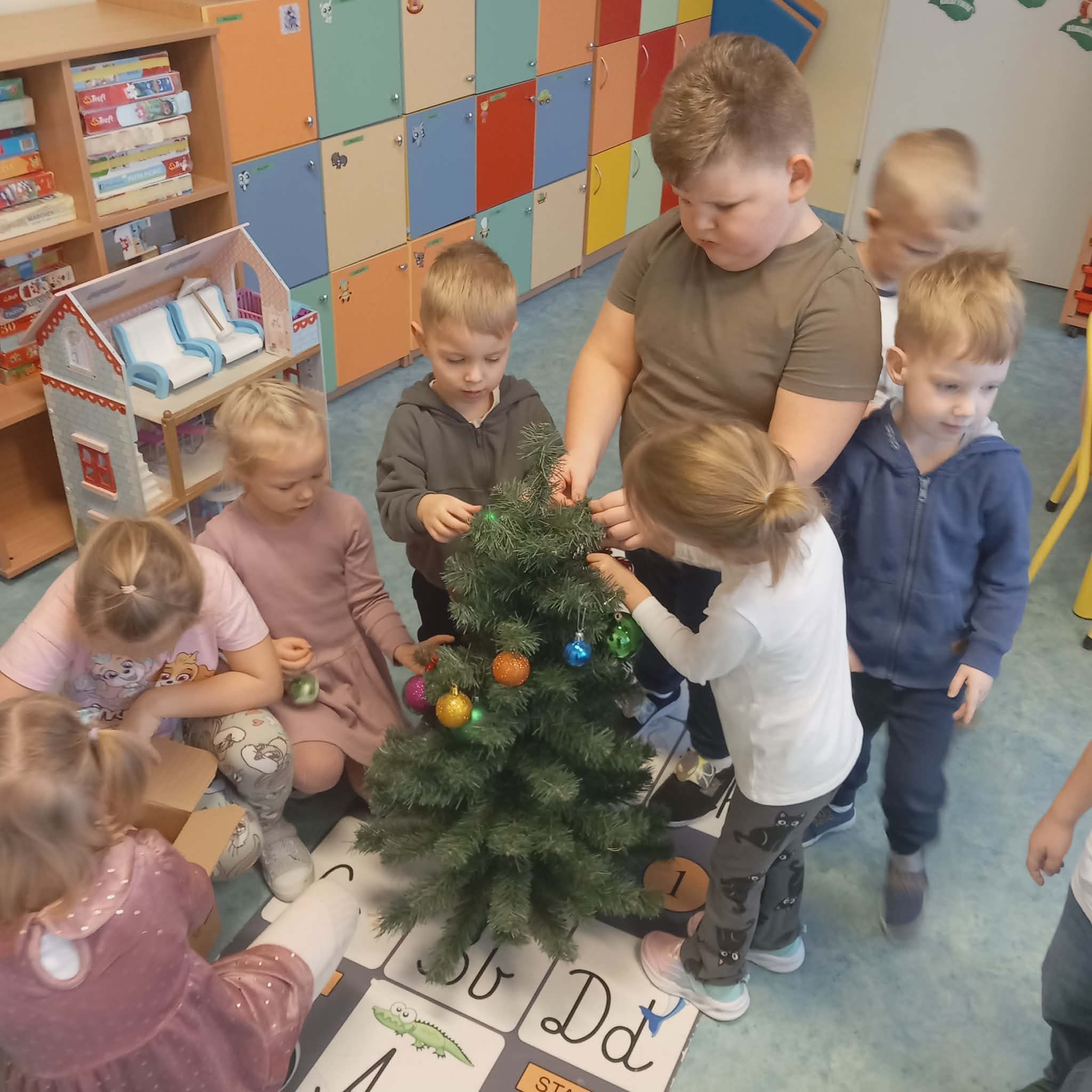 Okres przedświąteczny w naszym przedszkolu był pełen radości i przygotowań. Dziś odbyła się przedszkolna Wigilia, która była wyjątkowym wydarzeniem dla wszystkich dzieci. Przedszkolaki otrzymały miłe upominki, które Mikołaj zostawił niespodziewanie, sprawiając im wiele radości. Przed świętami wspólnie przygotowywaliśmy się do tego dnia, wykonując różne prace plastyczne i dekoracje, dzięki którym w przedszkolu zapanowała prawdziwie świąteczna atmosfera.