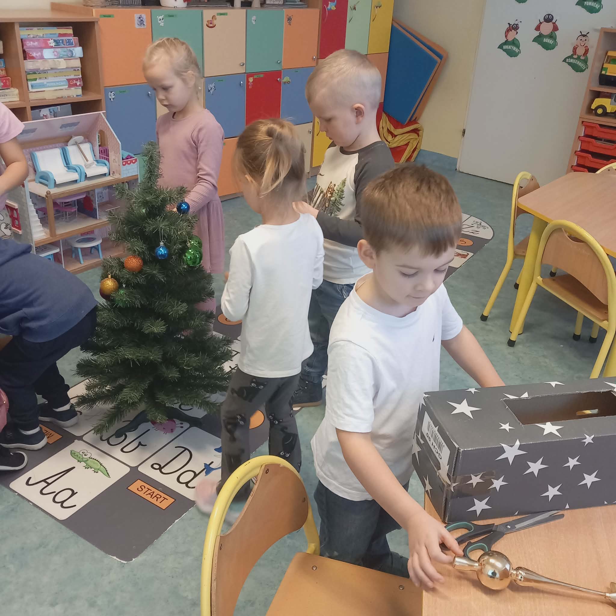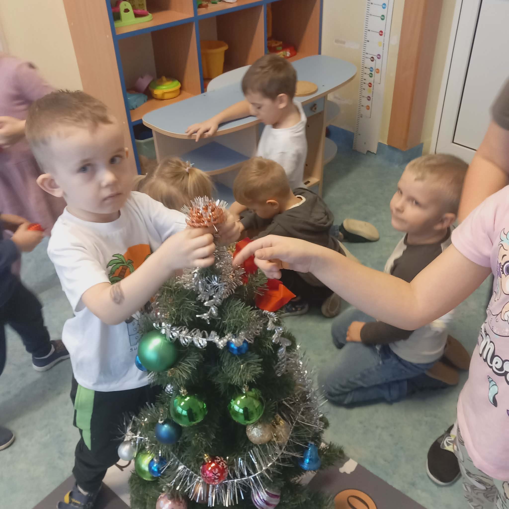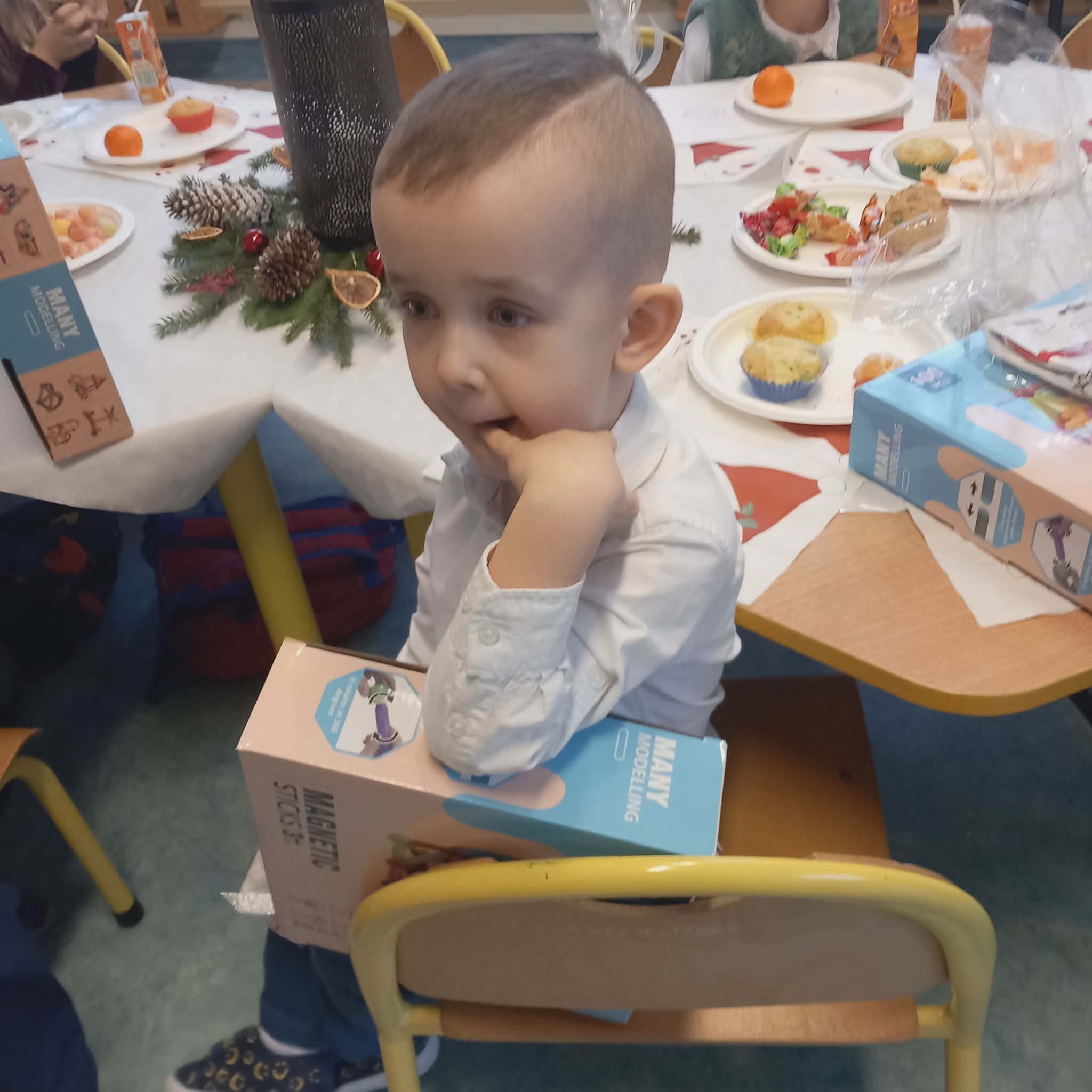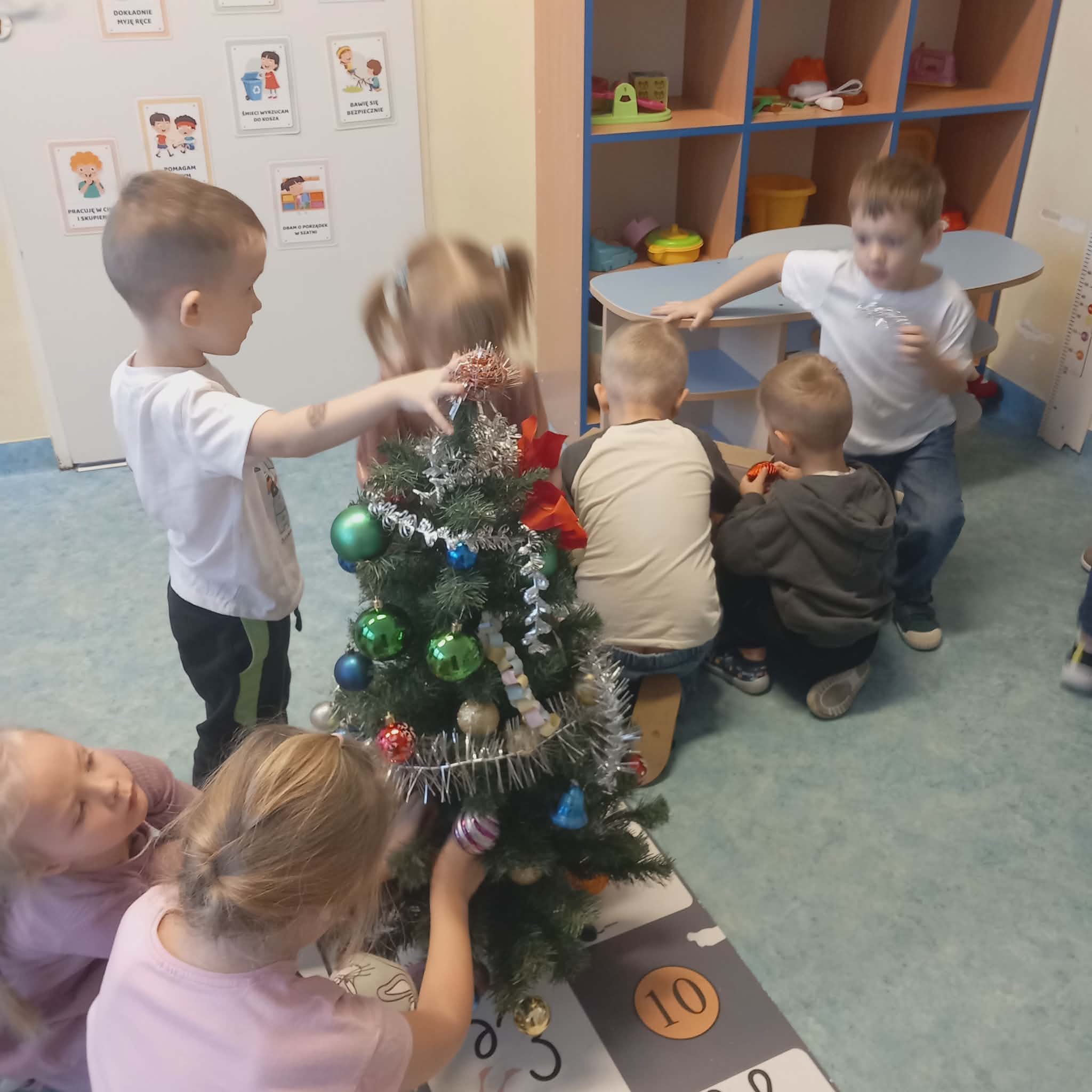Okres przedświąteczny w naszym przedszkolu był pełen radości i przygotowań. Dziś odbyła się przedszkolna Wigilia, która była wyjątkowym wydarzeniem dla wszystkich dzieci. Przedszkolaki otrzymały miłe upominki, które Mikołaj zostawił niespodziewanie, sprawiając im wiele radości. Przed świętami wspólnie przygotowywaliśmy się do tego dnia, wykonując różne prace plastyczne i dekoracje, dzięki którym w przedszkolu zapanowała prawdziwie świąteczna atmosfera.