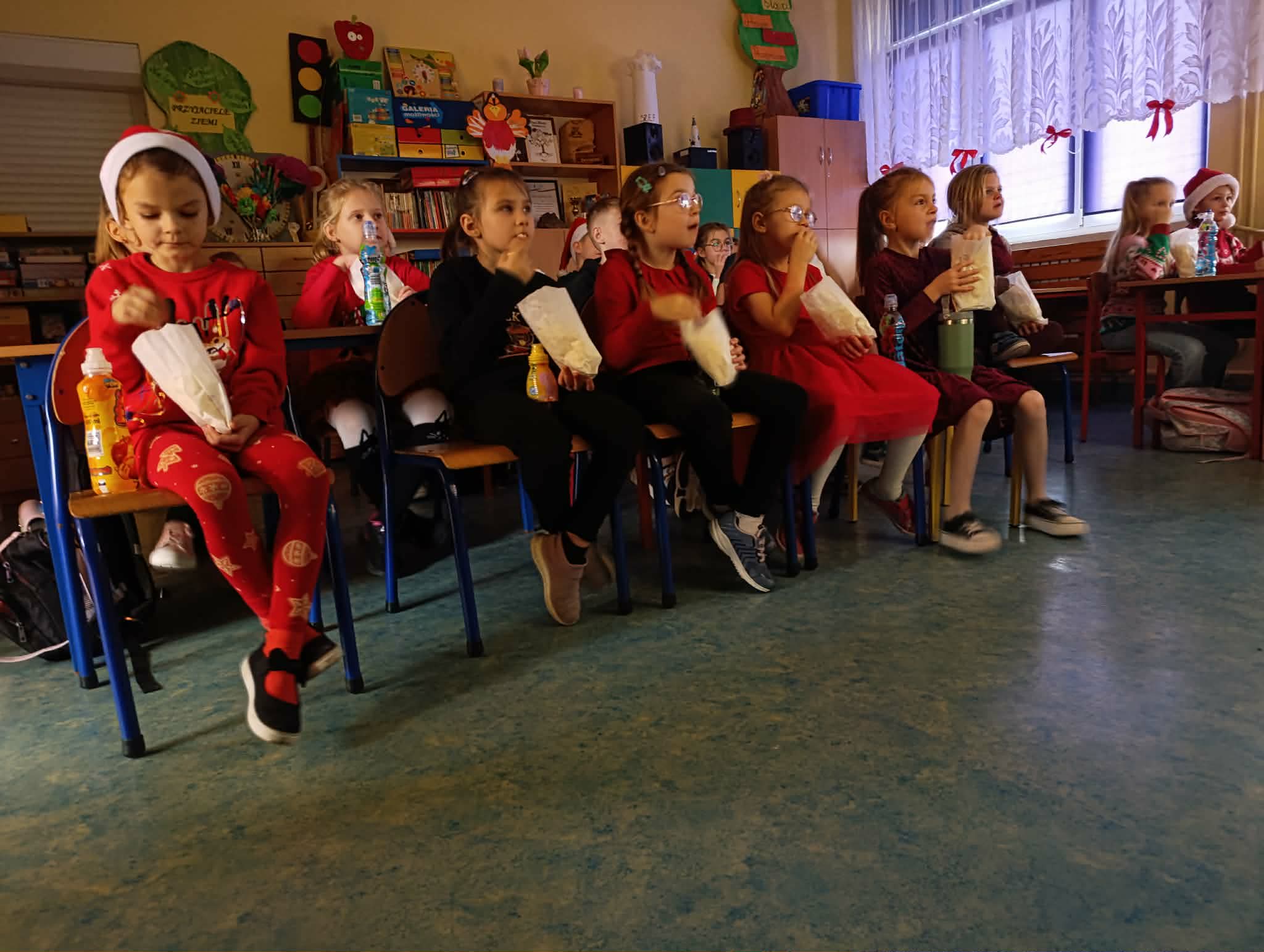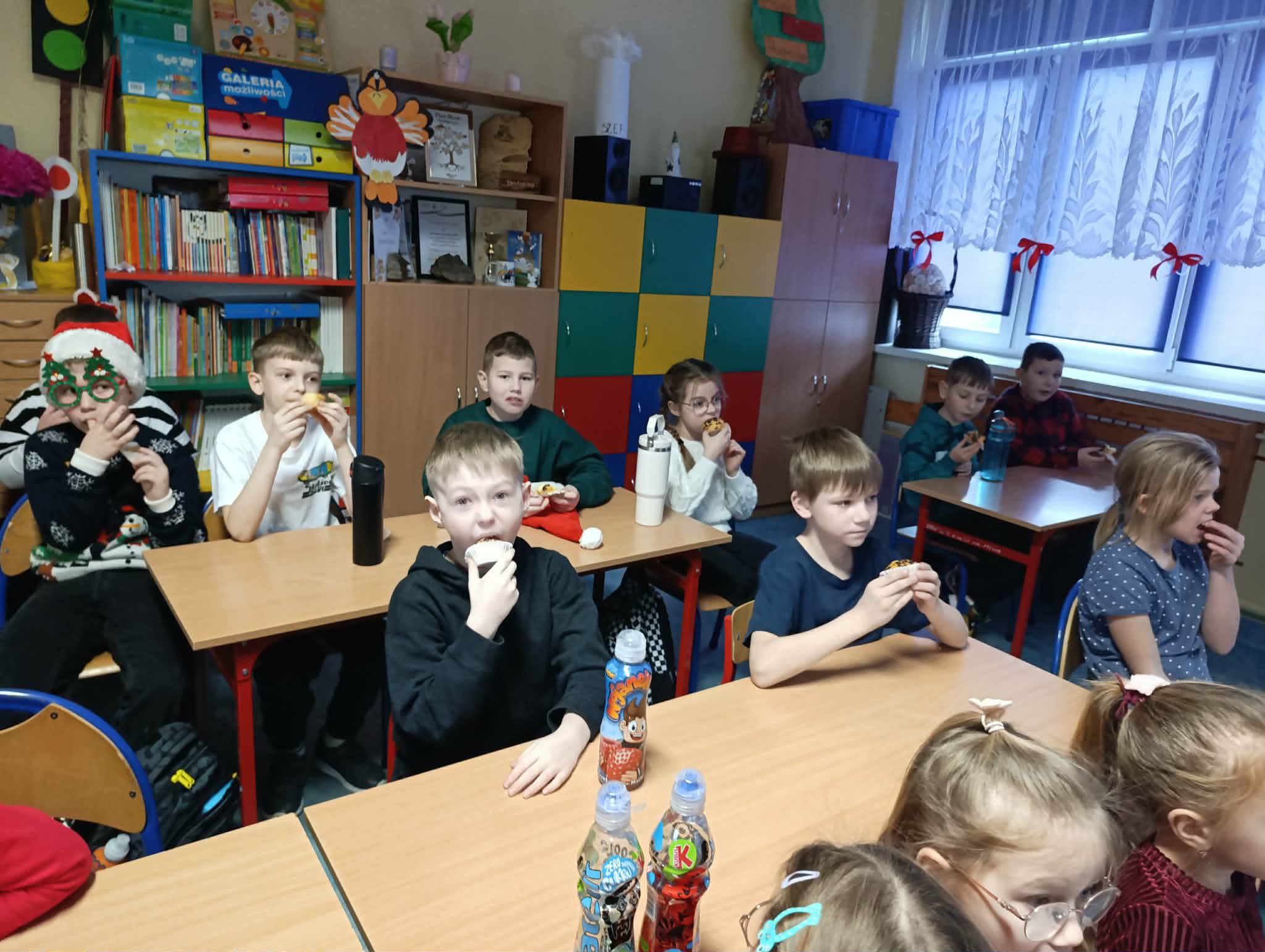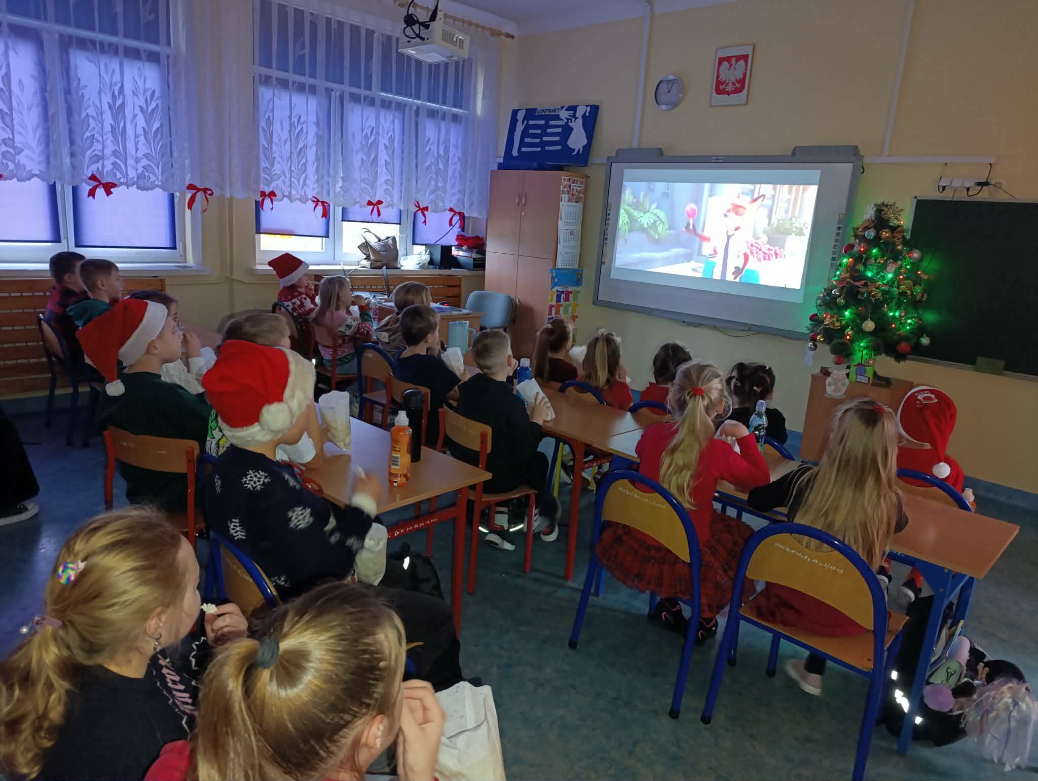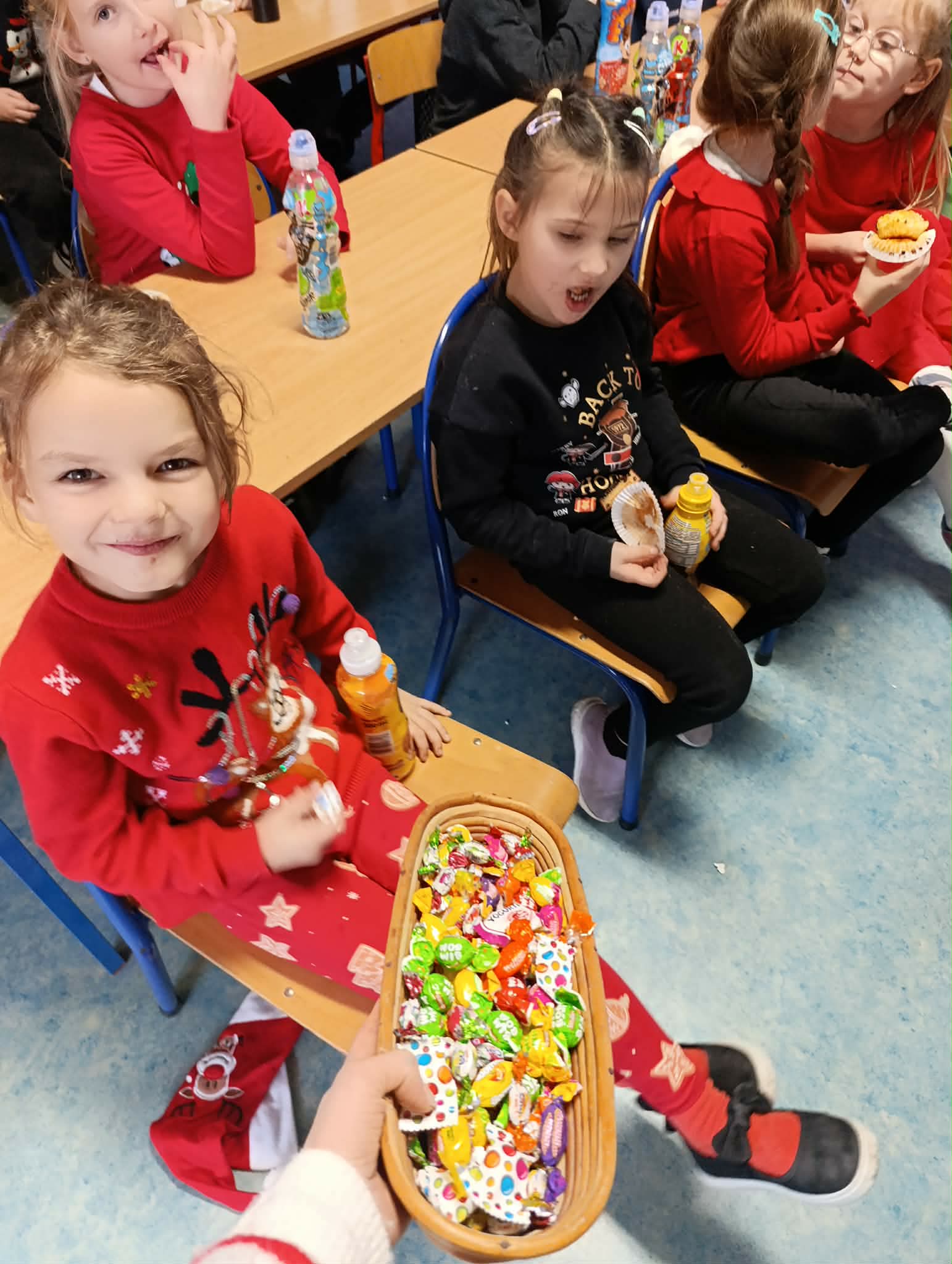 Mikołajkowa niespodzianka dla uczniów klas I–III Tego dnia na twarzach dzieci od samego rana gościł uśmiech, a atmosfera była pełna radości. Uczniowie otrzymali drobne upominki od Mikołaja. Po rozdaniu prezentów wszyscy wspólnie obejrzeli świąteczny film, zajadając się popcornem i pysznymi babeczkami. Było dużo śmiechu, ciepła i wspólnego spędzania czasu – dokładnie tak, jak powinny wyglądać Mikołajki!
