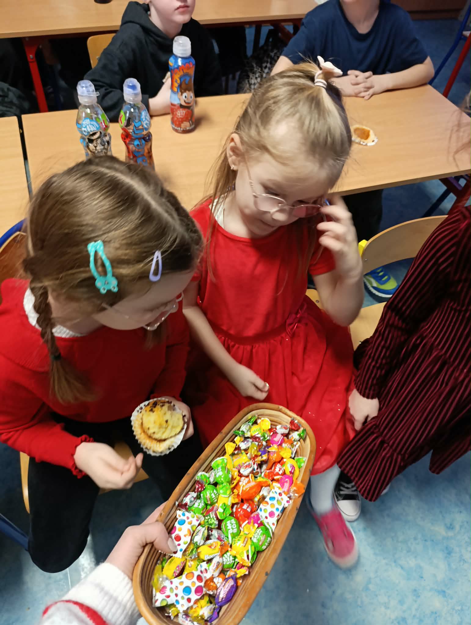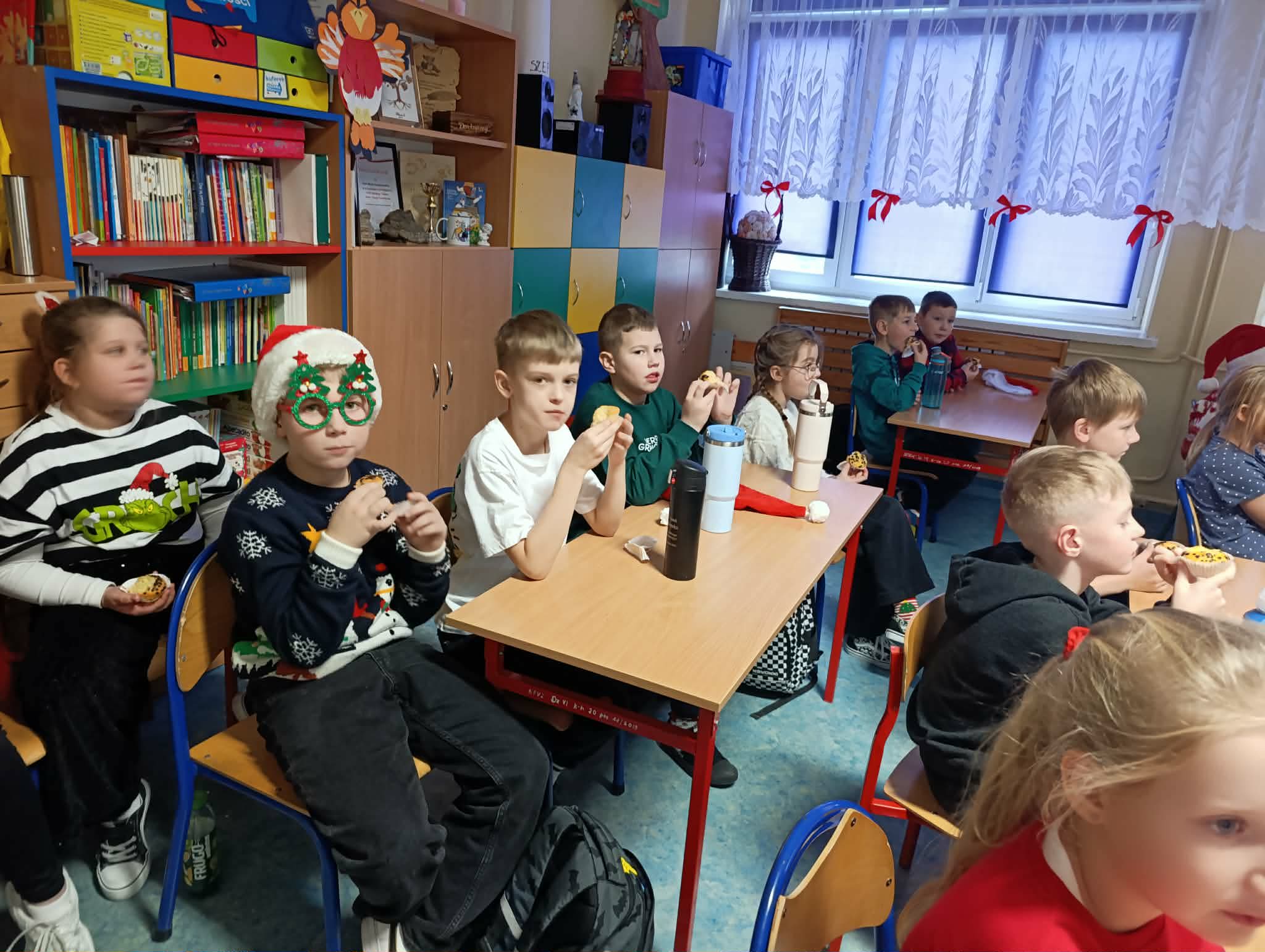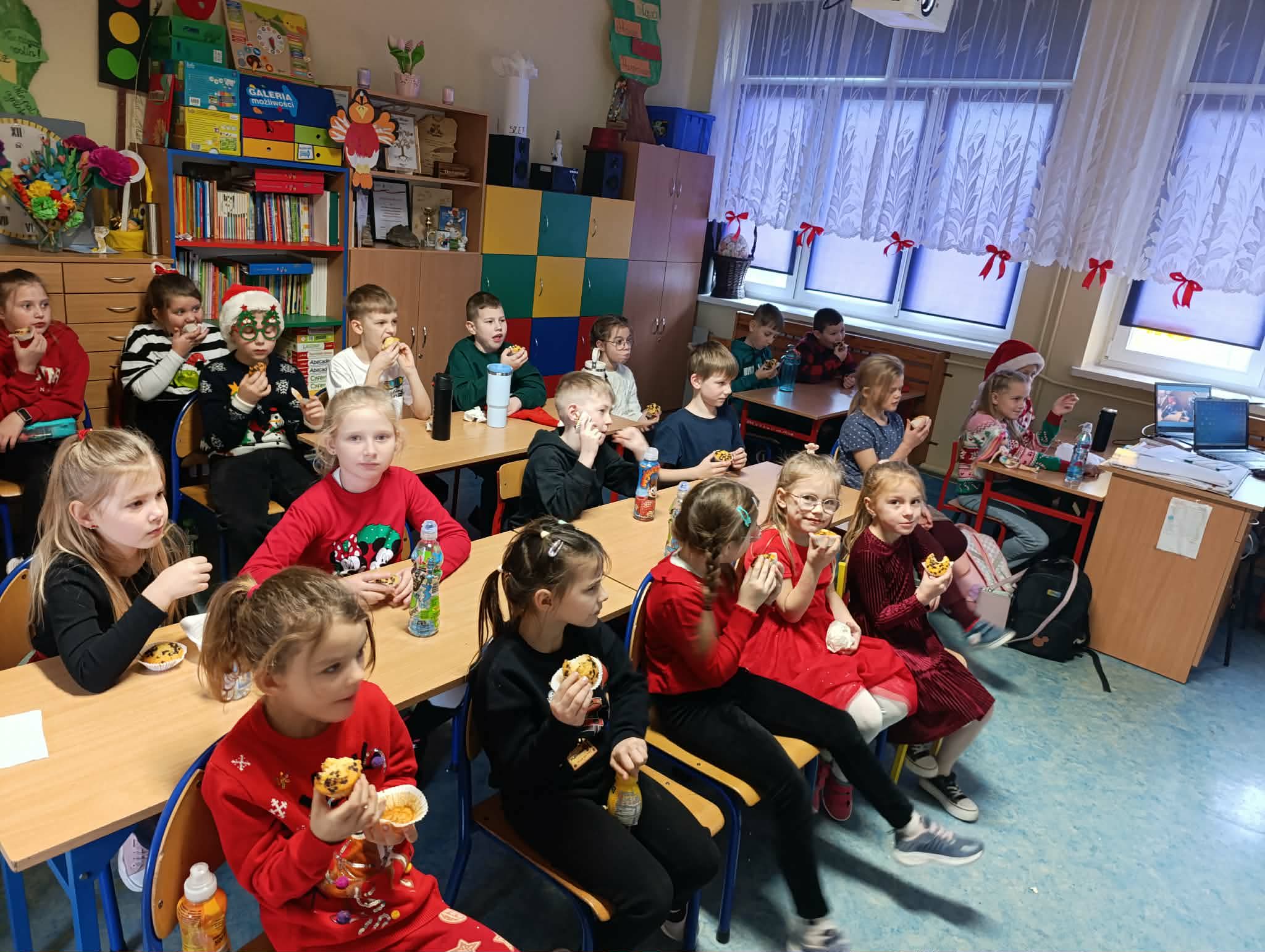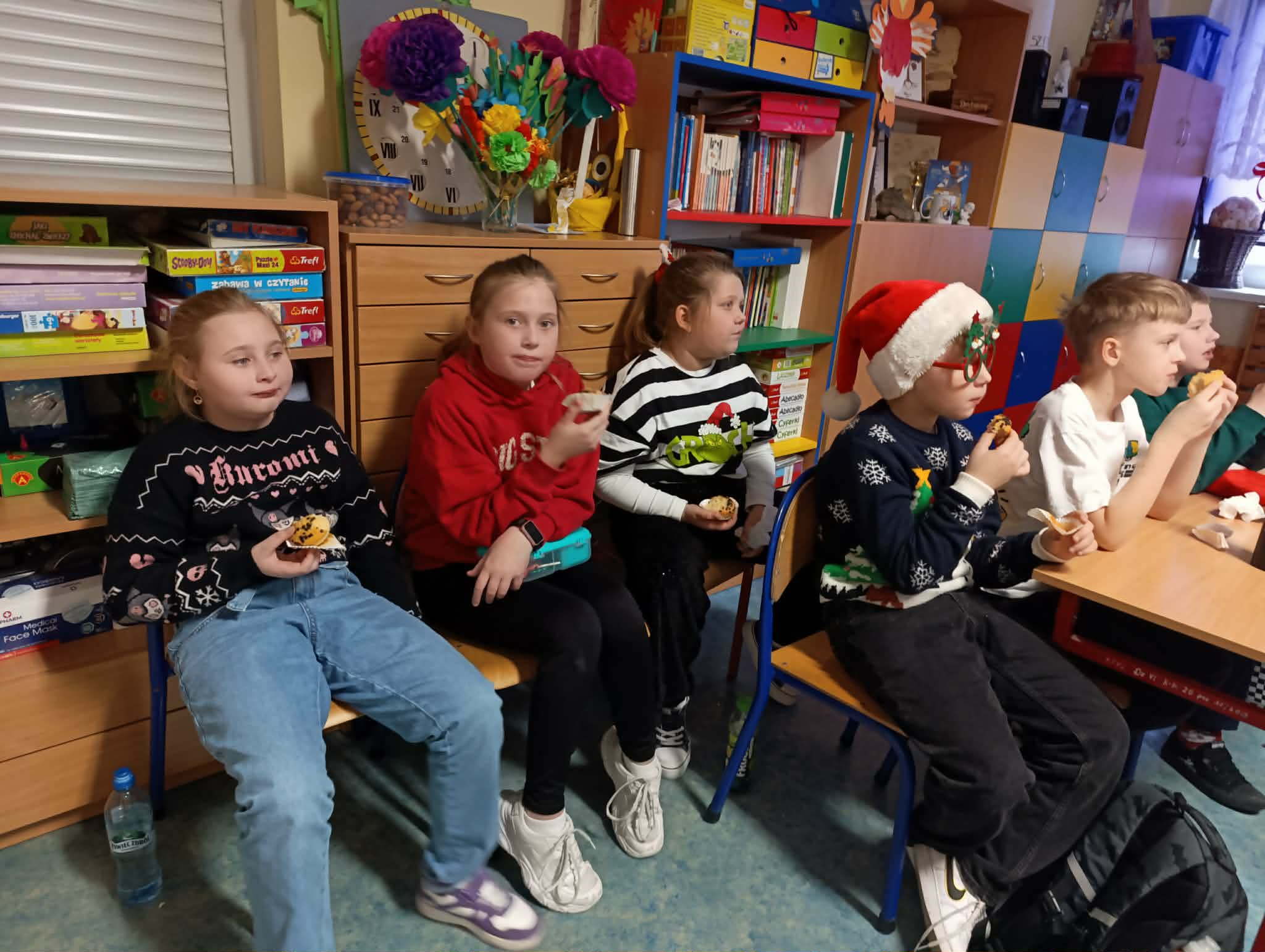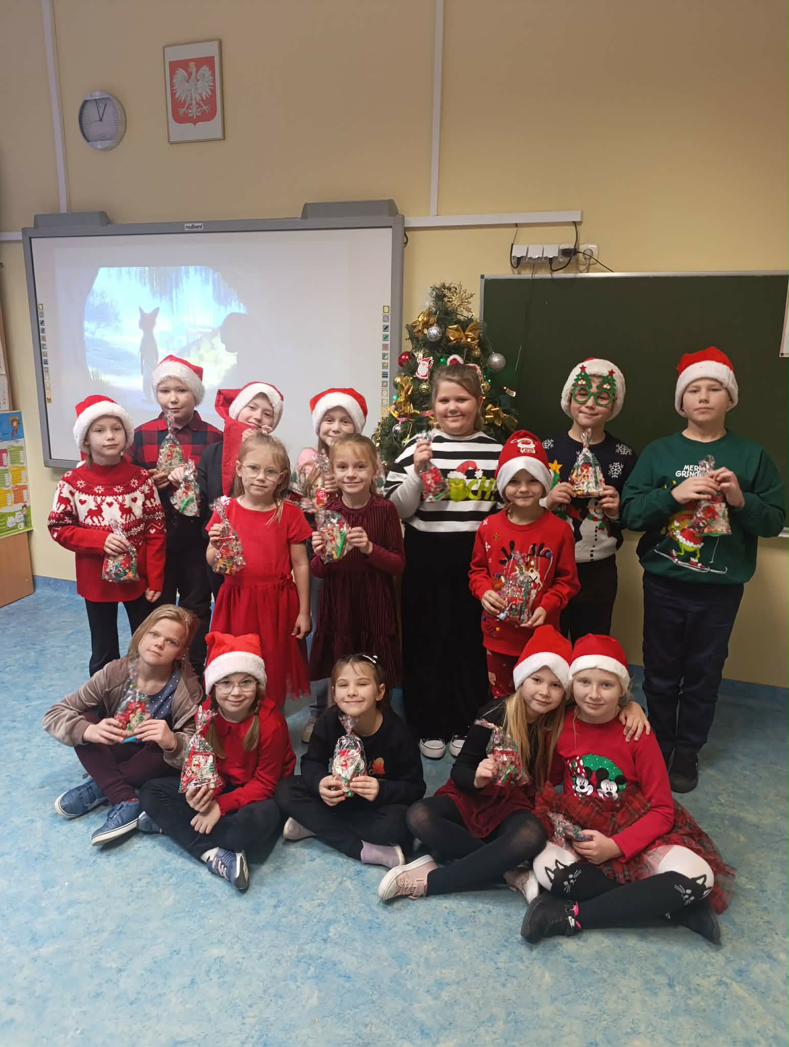 Mikołajkowa niespodzianka dla uczniów klas I–III Tego dnia na twarzach dzieci od samego rana gościł uśmiech, a atmosfera była pełna radości. Uczniowie otrzymali drobne upominki od Mikołaja. Po rozdaniu prezentów wszyscy wspólnie obejrzeli świąteczny film, zajadając się popcornem i pysznymi babeczkami. Było dużo śmiechu, ciepła i wspólnego spędzania czasu – dokładnie tak, jak powinny wyglądać Mikołajki!