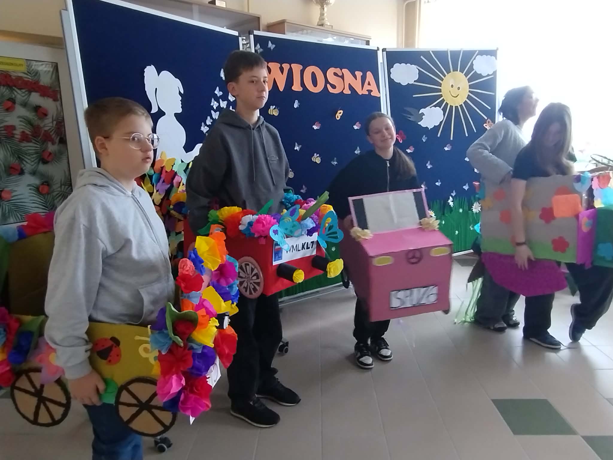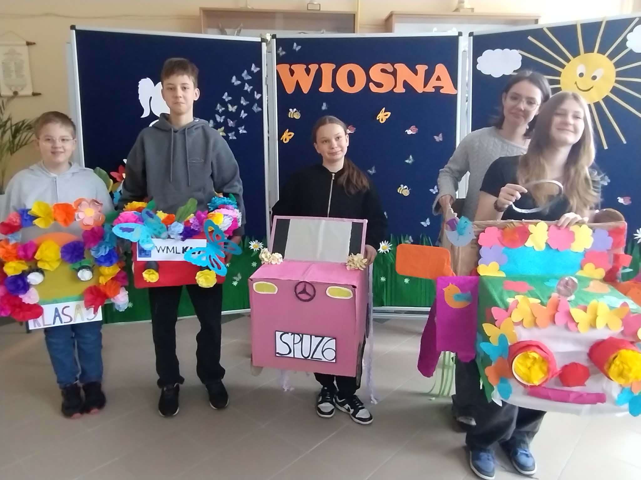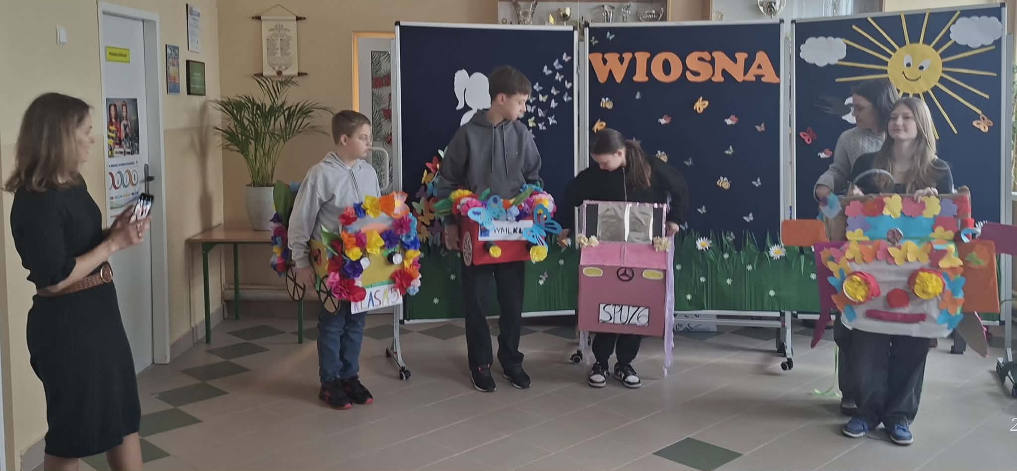 Pierwszy Dzień Wiosny w naszej szkole Na korytarzach naszej szkoły na dobre zagościła wiosna! Kolorowe dekoracje, przygotowane przez Samorząd Uczniowski oraz dzieci ze świetlicy wraz z opiekunami, wprowadziły wszystkich w radosny, wiosenny nastrój. Swoją radość z nadejścia tej pięknej pory roku dziewczęta z klasy 6 wyraziły poprzez taniec Zaprezentowany układ został nagrodzony gromkimi brawami! Następnie odbył się wyjątkowy pokaz wiosennych aut wykonanych z kartonu i ozdobionych kwiatami oraz wiosennymi dodatkami. Był to świetny pomysł Samorządu Uczniowskiego – zadanie rozwinęło kreatywność, umiejętność pracy zespołowej oraz wzmocniło relacje między uczniami. Uczniowie klas 1–3 również wykazali się ogromnym zaangażowaniem, tworząc w grupach mega plakaty wiosenne Gratulujemy wspaniałych pomysłów! Świętowanie zakończyliśmy wspólnym ogniskiem , zorganizowanym we współpracy z Rodzicami i pracownikami szkoły. Dziękujemy za miło spędzony czas i wspólne powitanie wiosny!